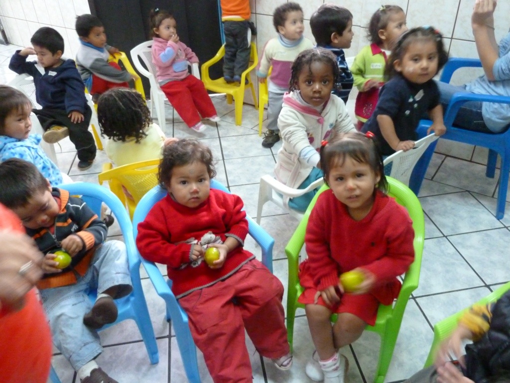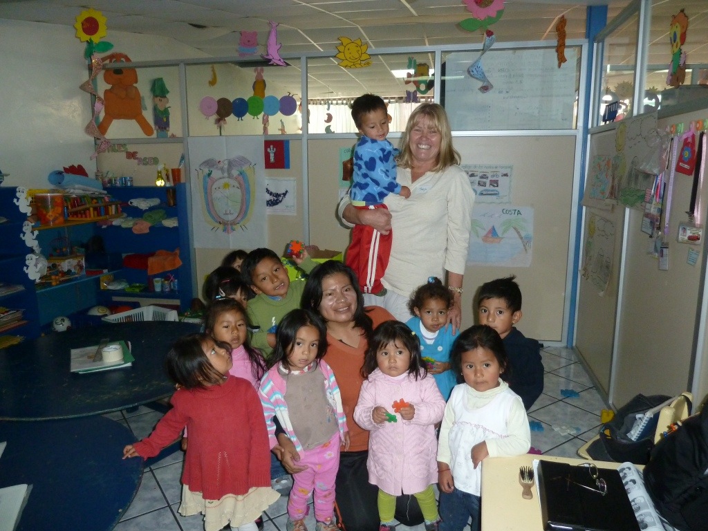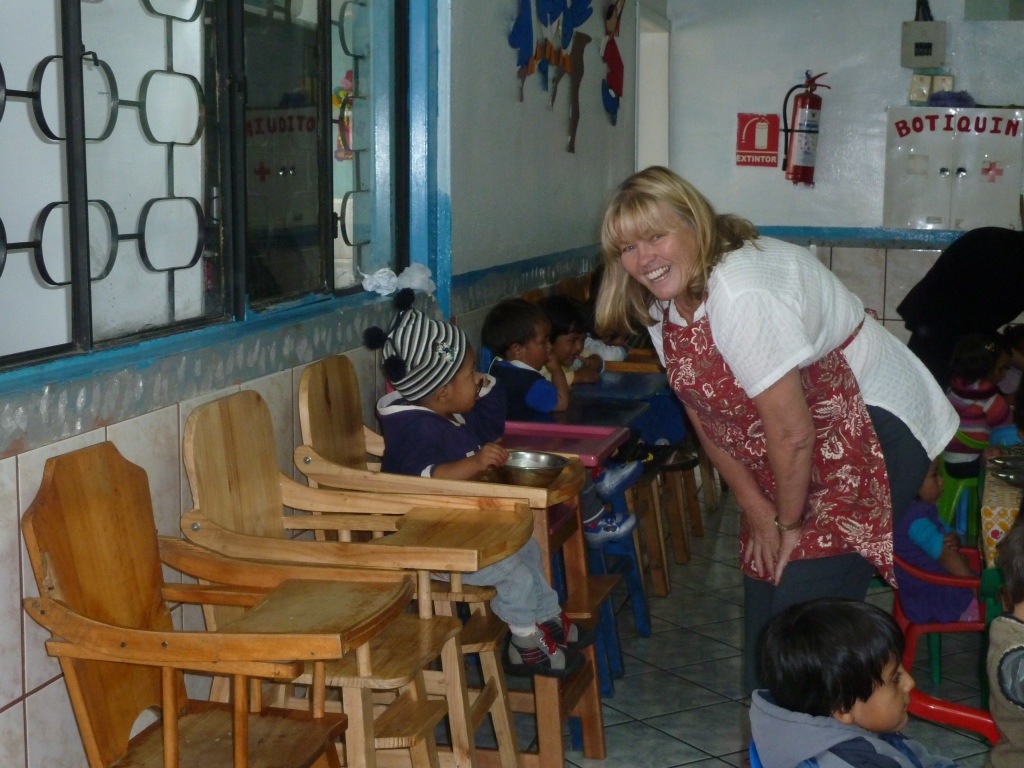 Neal and Suzanne from the San Francisco area, Tom and his 14 hear old daughter Katie from Atlanta, Georgia make up my team. We are up early for breakfast, morning meetings and on the road by 8 for the 30 to 40 minute commute from Quito to Calderon which is its own separate town but feels more like a suburb of Quito. From the moment we walk through the door, we are set to work … Neal helping three Tias (the women are all called Tias, including us, which translates to ‘Auntie’) with cooking in the kitchen, Tom helping a local contractor build storage and book shelves for the Center, and Kate, Suzanne and I opt for working with the children. We are all assigned a classroom with three and four year olds …. mine is with Tia Ruby who does not speak a word of English! As the week wore on, Ruby and I learned to communicate reasonably well, despite my slow growth vocabulary ….. a cheat sheet and running often to Maggie or Neal for translation helped π … Neal just happens to be a teacher with a primarily Latino student base back in California and if not quite as fluent as Maggie in Spanish, good enough!! Such a blessing for our group!