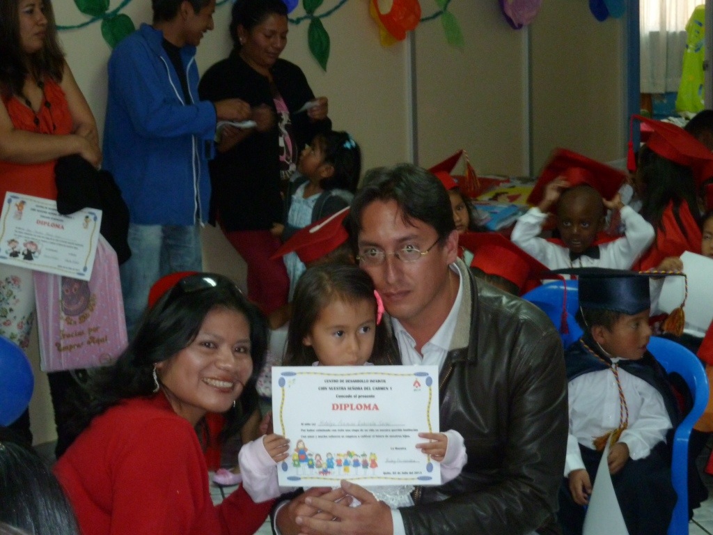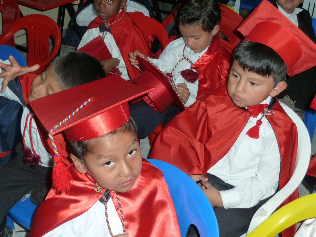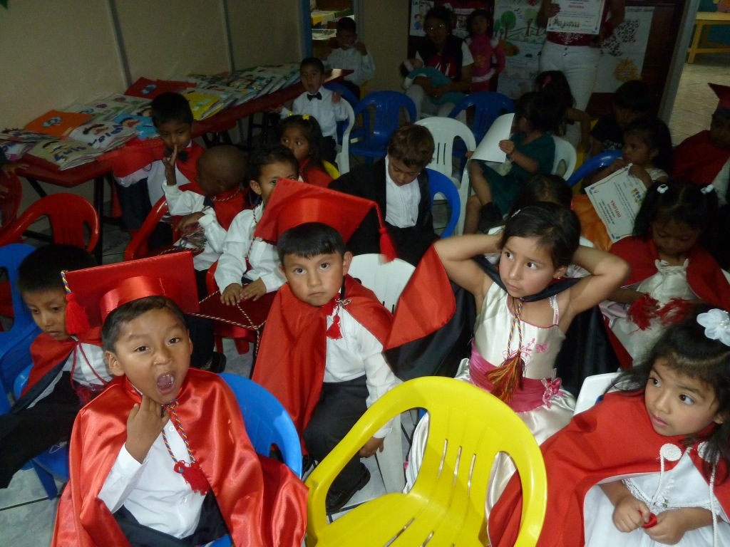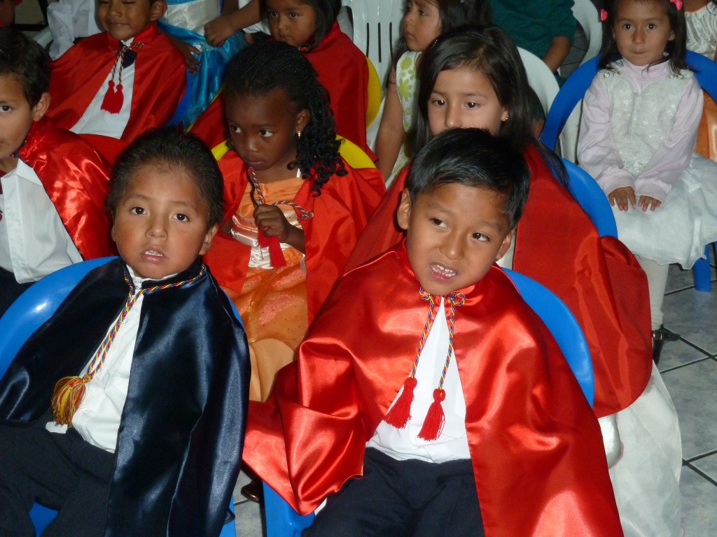 Friday was a totally unexpected fun-filled day for us all …. volunteers, Tias, the children, their siblings and parents alike! Ecuadorians love a good party and what better excuse than ‘graduation day’ for the five year olds moving up to kindergarten in the fall! We worked all week on the completion and decorating of the booklets showcasing the children’s work over the year. Friday morning was spent decorating the walls with paper flower garlands and a blue and white balloon archway for the grads to walk through! The staff cleaned and scrubbed the center spotless! … we helped set up rows of chairs and by 2 pm, the place was buzzing!! … the children were dressed to the nines in their Sunday best, the parents much the same … not sure if many of the children’s dads were there, (most are single moms at the center) but a male presence certainly was … grandpas and uncles perhaps … it was a lovely spectacle of celebration … a photographer was hired and took pictures of the children, wearing red capes and hats, receiving their ‘diplomas’ from their various Tias … red and white must have been the colours of the day, as all the Tias wore white pants with red tops for the occasion as well … rather sweet. Ecuadorians are quite conscious of appearances, and good grooming, clean tidy clothes are the norm, regardless of economic status !! ….. the only sloppiness came from the volunteers, as we were all dressed in our work clothes, not fully aware how big an event this day was going to be when we left our hotel in the morning. We helped serve cake and juice after the ceremony and joined in, dancing with the kids, the Tias, each other! …. we topped the day further by enjoying an awesome dinner at Hermosa Rooftop Restaurant in old town … complete with that stunning ambiance of cathedrals and twinkling lights surrounding us. My second time there and hopefully not my last before I fly home … I could sit there absorbing that view time and time again!! Another great day and week in Ecuador!