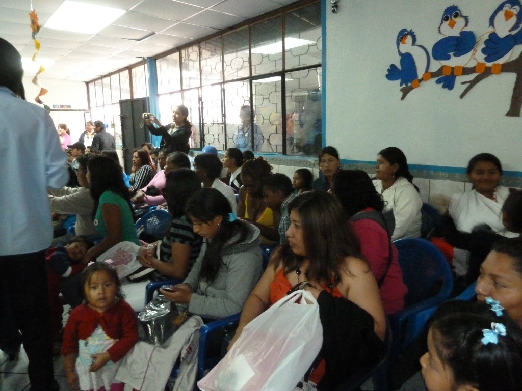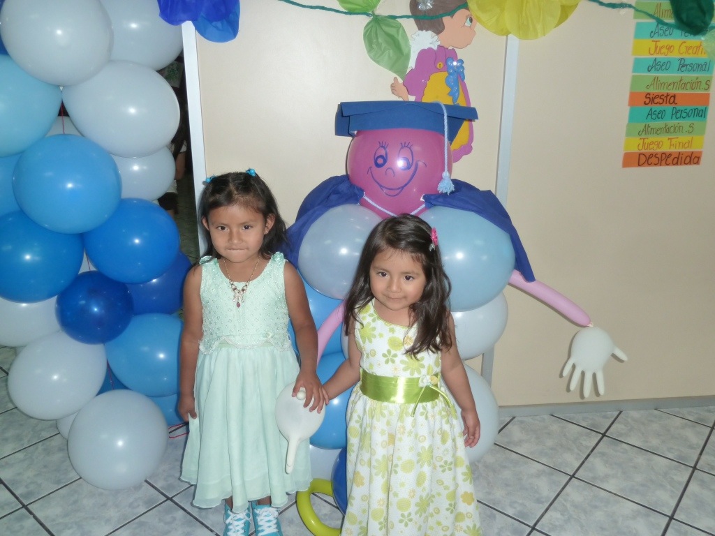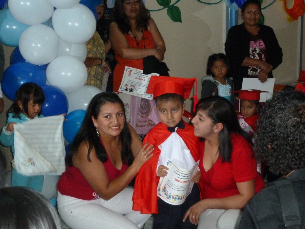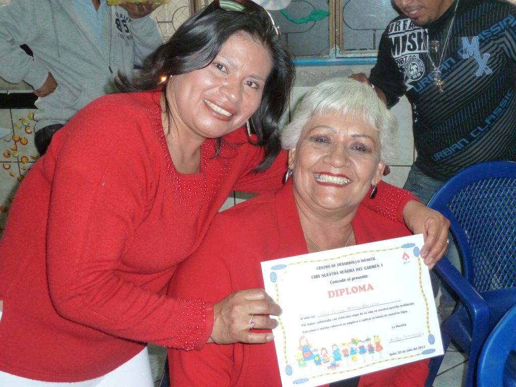 Friday was a totally unexpected fun-filled day for us all …. volunteers, Tias, the children, their siblings and parents alike! Ecuadorians love a good party and what better excuse than ‘graduation day’ for the five year olds moving up to kindergarten in the fall! We worked all week on the completion and decorating of the booklets showcasing the children’s work over the year. Friday morning was spent decorating the walls with paper flower garlands and a blue and white balloon archway for the grads to walk through! The staff cleaned and scrubbed the center spotless! … we helped set up rows of chairs and by 2 pm, the place was buzzing!! … the children were dressed to the nines in their Sunday best, the parents much the same … not sure if many of the children’s dads were there, (most are single moms at the center) but a male presence certainly was … grandpas and uncles perhaps … it was a lovely spectacle of celebration … a photographer was hired and took pictures of the children, wearing red capes and hats, receiving their ‘diplomas’ from their various Tias … red and white must have been the colours of the day, as all the Tias wore white pants with red tops for the occasion as well … rather sweet. Ecuadorians are quite conscious of appearances, and good grooming, clean tidy clothes are the norm, regardless of economic status !! ….. the only sloppiness came from the volunteers, as we were all dressed in our work clothes, not fully aware how big an event this day was going to be when we left our hotel in the morning. We helped serve cake and juice after the ceremony and joined in, dancing with the kids, the Tias, each other! …. we topped the day further by enjoying an awesome dinner at Hermosa Rooftop Restaurant in old town … complete with that stunning ambiance of cathedrals and twinkling lights surrounding us. My second time there and hopefully not my last before I fly home … I could sit there absorbing that view time and time again!! Another great day and week in Ecuador!