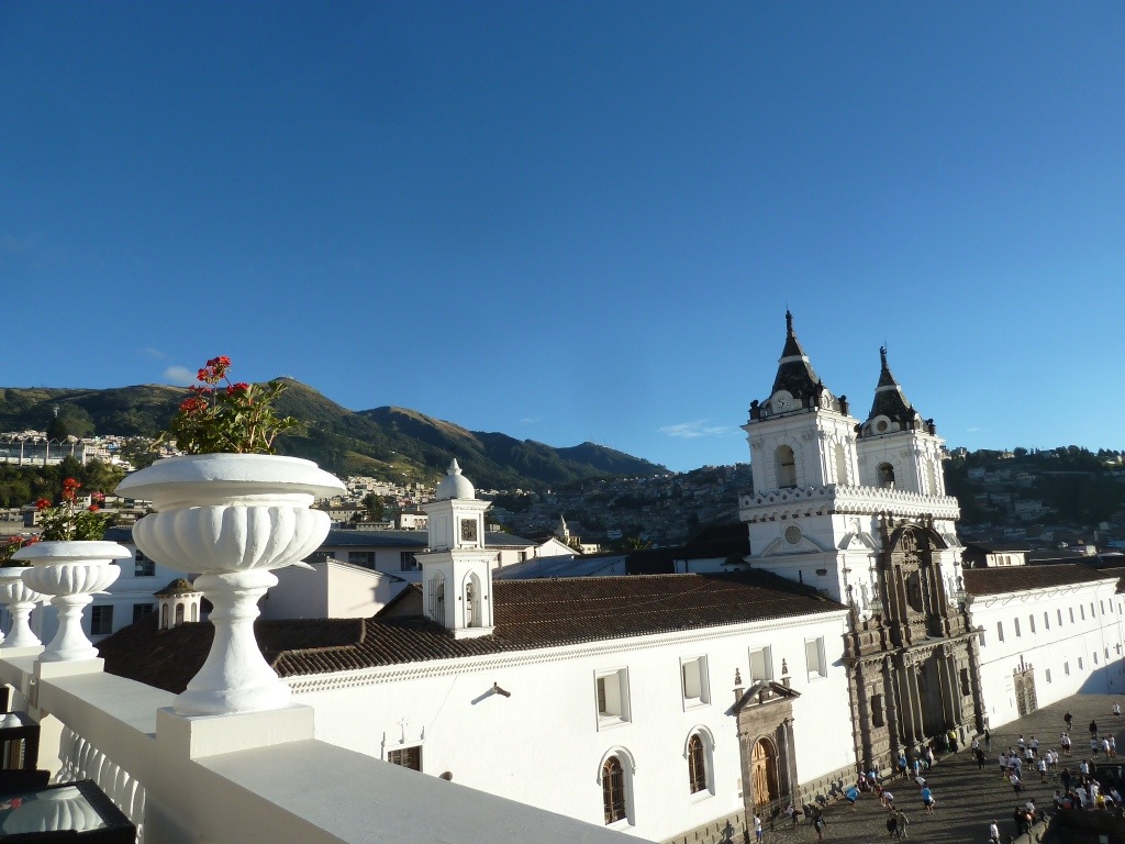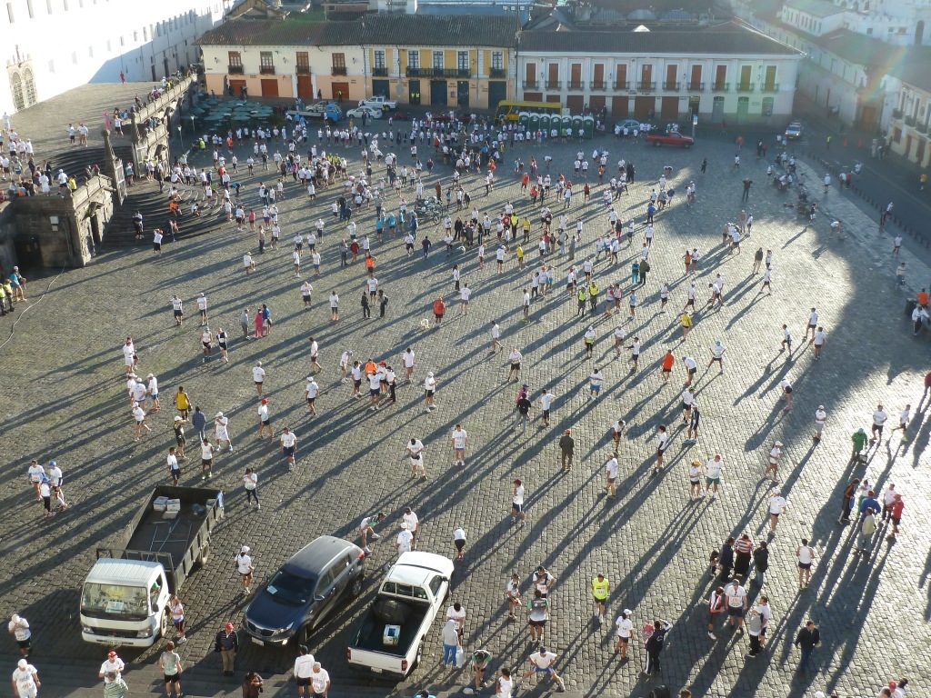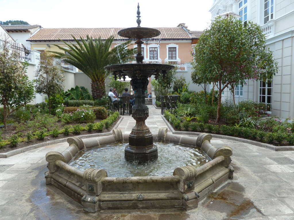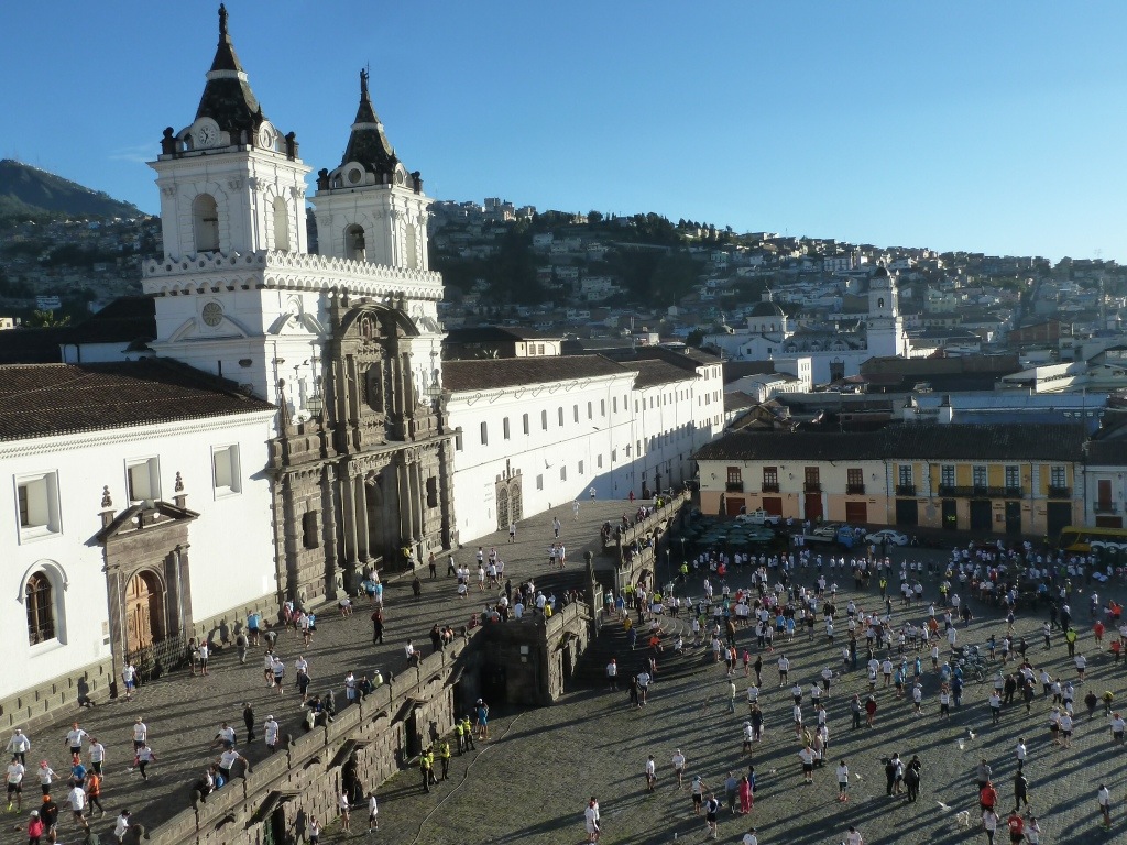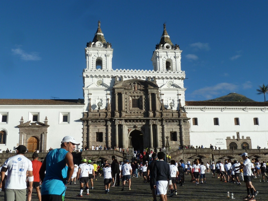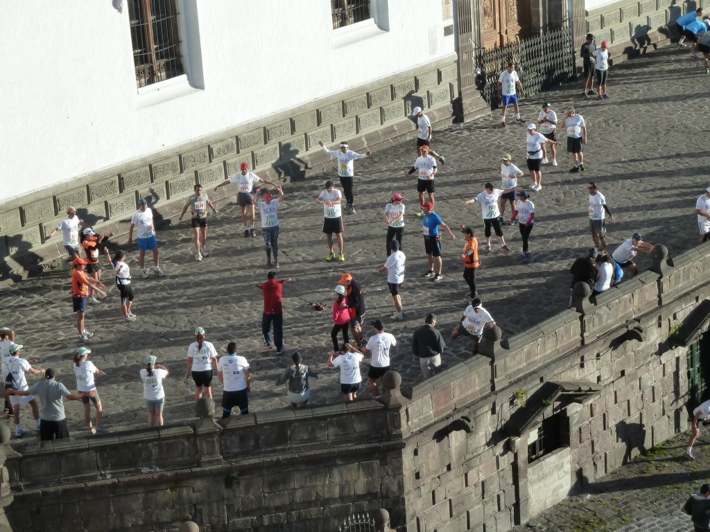 Taking a few days to hang out as a tourist before flying home. I am staying in the charming historical center of Quito, at yet another restored old mansion, in yet another World UNESCO heritage site!! …. this one has belonged to the Gangotena family for the past hundred years. There was a major fire that just about destroyed the whole house in the early 1900’s. It required a complete restoration … a team of Italian architects and craftsman were hired … easy to tell from the Italian arches and pillars everywhere, not to mention fountains π I woke up this morning (around 4:30 am … thankfully I had crashed early π to loud music blaring in front of the hotel …. the hotel overlooks the wide sweeping cobblestone Plaza San Francisco, backed by the mountainous backdrop of Volcan Pichincha. A stunning location! There was a running marathon starting up!! I listened for a few hours, dozing fitfully on and off and finally around 6:30, realizing sleep was impossible, joined everyone in the square, a minute’s walk from my room … some 13 and 20 km runners had already finished … there were 13, 20, 40, and 60 km runs organized!! Apparently a yearly event in Quito … seems wherever I hang my hat in Ecuador, I bump into these yearly festivals or events unawares … it was a pleasant sight that greeted me in the square … those finished their shorter runs, were participating in a warm down exercise class, which I also joined in on π Not a bad wake up call after all π … loved walking these old streets today … totally exhilarating to get some exercise and sunshine in after the last few weeks where it just never seemed to work out time wise … this cobbly town is just fabulous!! … street musicians and entertainers on every block! …. it is Sunday! ….. even managed to sit down to mass at one point in the Monasterio de San Francisco, Quito’s largest colonial structure and a convenient few steps from Gangotena π ….. love the Andean Indigenous flute music best … I was in heaven, strolling here and there all day, music following me everywhere …. could not have asked for a more delightful day to finish my time here in Ecuador!