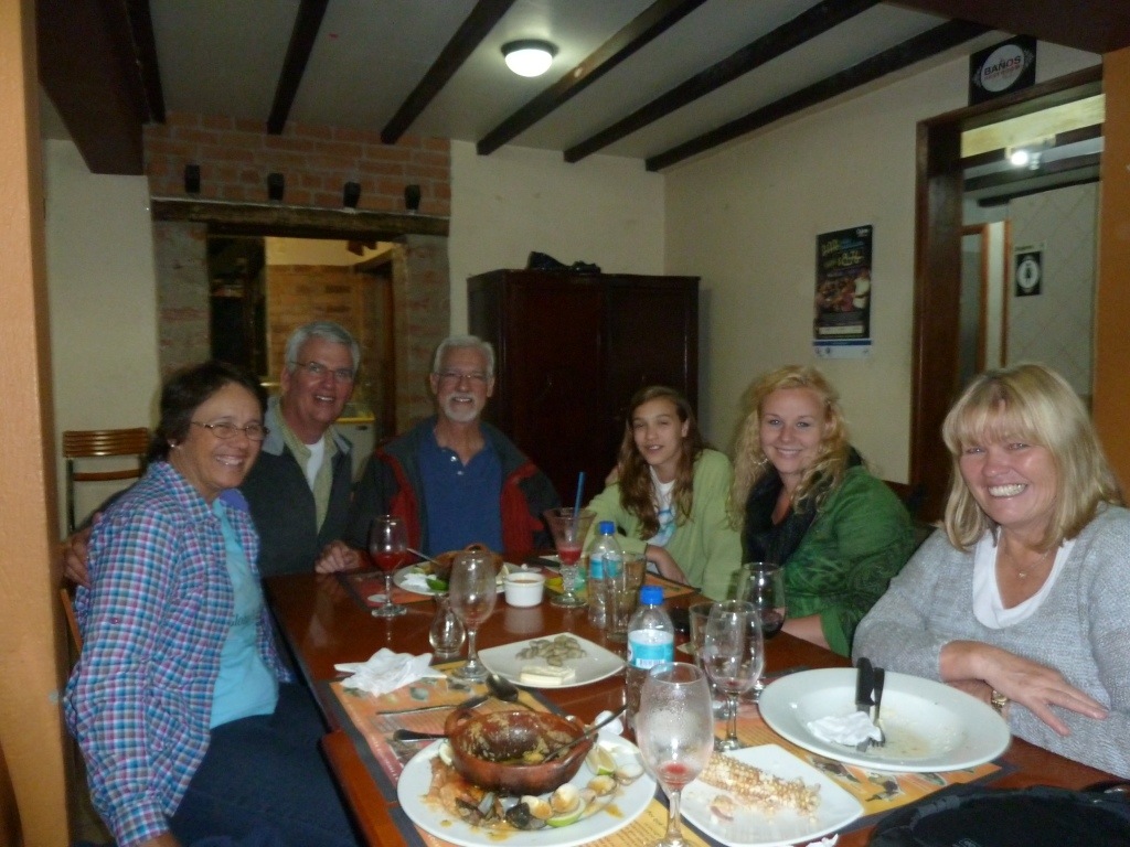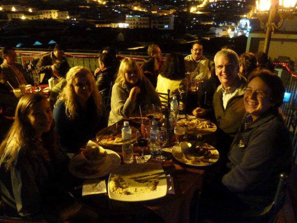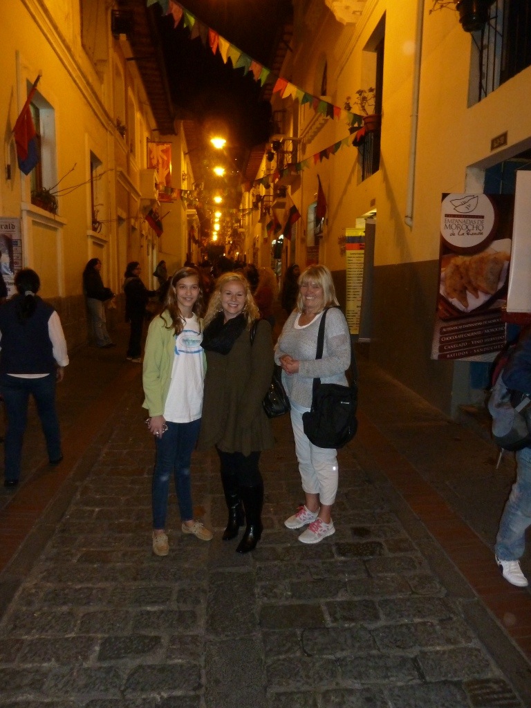 Maggie thought we would enjoy Ronda Street in old town, for a different kind of dinner for our last together as a group ….. known for it’s streetside cafe hopping, live music, buskers and general party atmosphere …. a lively place certainly, on a Friday night …. giant cheese empanadas and beer at one place, fish stews, salads, washed down with canelazo, a local hot spiced berry and white corn liqueur drink at another … guitar, flute music and singing accompanied our dinner stops … a fitting end to our time together … emotional goodbyes and off to bed … exhausting, fulfilling weeks now behind us. Neal and Suzanne leave in the early morning for Banos Hot Springs for three days before heading back to San Francisco, Tom and Kate for home in Atlanta, Georgia, and I, to old town Quito for my last two days in Quito. Hasta Luego and much love to everyone but especially the Tias and children of Calderon ….