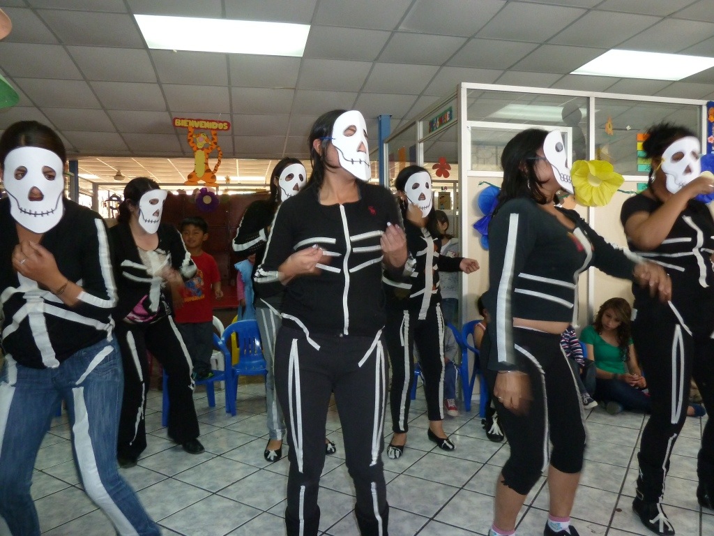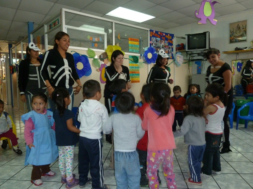 I will surely miss this troop at Center One! The Tias put on a good party for us today … dressed up as skeletons, (something meaningful to Ecuadorian folks apparently) and did an interpretive song and dance in our honour …. they had a good fun day preparing, while we all went about our various chores of the day, feeling just a tad sad that it was our last day at the center. Our Barney Song was well received, both versions, but especially our Spanish one π … and we managed to get the children to smile if not exactly laugh out loud!! Fundac’s Elvita and the Tias presented us with lovely homemade thank you cards and decorative dough art work which Calderon is known for … someone cranked up the speakers and the dancing got underway! We jived and jimmied and generally let loose, having fun with the staff and children. Emotional day … and we were all somewhat subdued on the drive back to Sol de Quito.