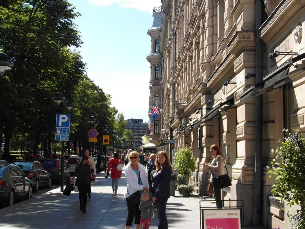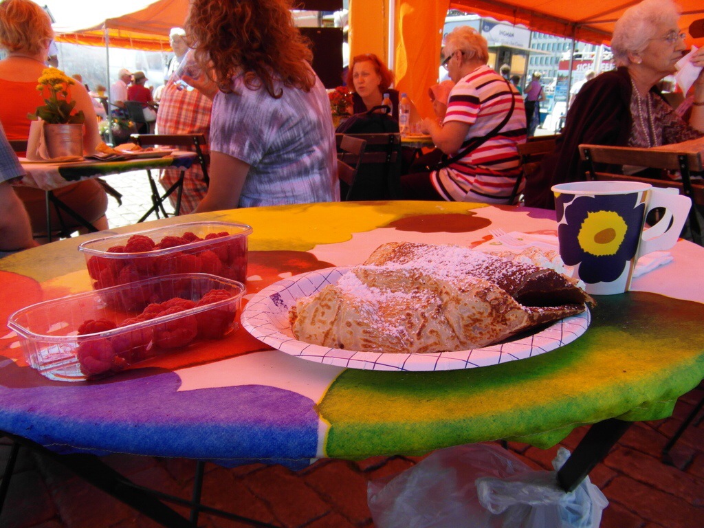 the skyline of Helsinki fade into the distance. From the air, the city is even more beautiful … dotted with so much green space, surrounded by forests and water, a lovely city center with its newish cobbly streets, charming cafés and the outdoor ‘Kauppatori” where Sarah, Aliana, Margaret, Jennifer and I savoured so many baskets of delicious sweet sun ripened strawberries, raspberries, garden peas, cherries, not to mention Finnish crepes!