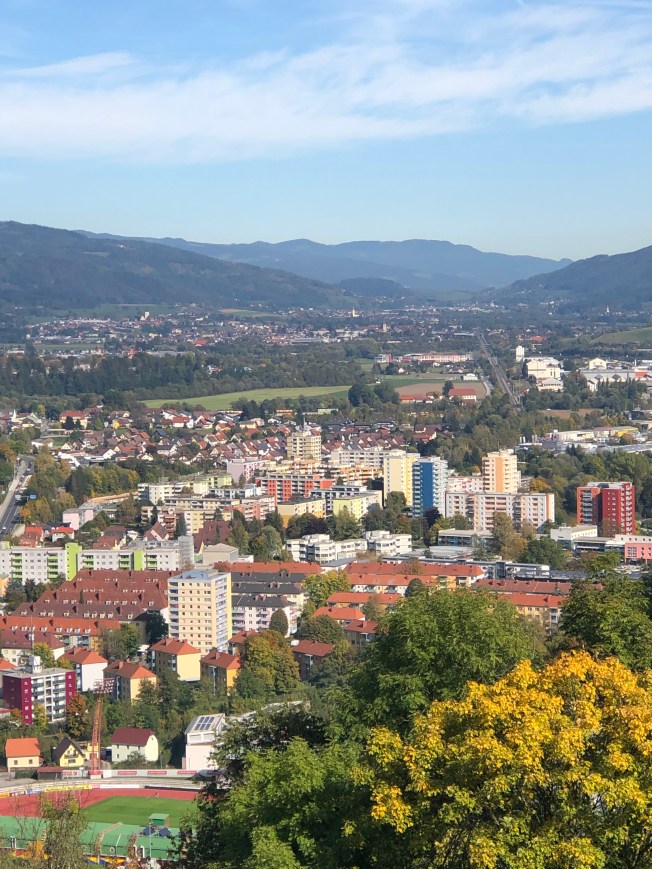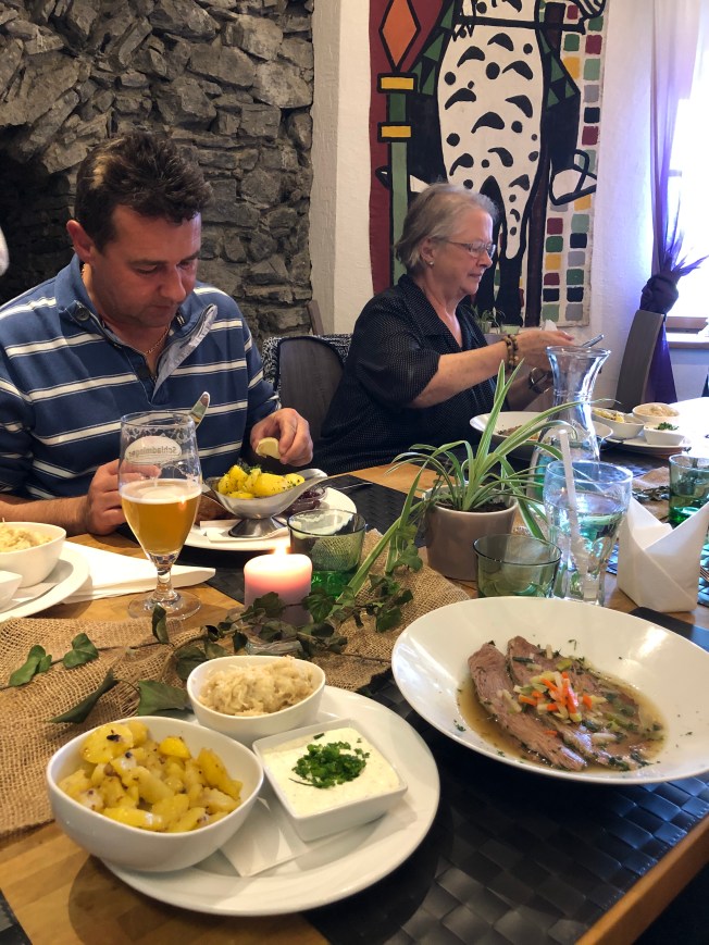 After a rather hair pin curvy drive up a narrow mountainside road, we arrived at the Burg Oberkapfenberg (Castle) to enjoy a tasty lunch of the ubiquitous Wiener schnitzel … certainly Linda’s favourite, goulash, tafelspitz, spaetzle, warm potato salads, fresh horseradish salad … it was quite the luncheon the eight of us savoured … all in a cozy castlesque cafe overlooking the town of Kapfenberg below …