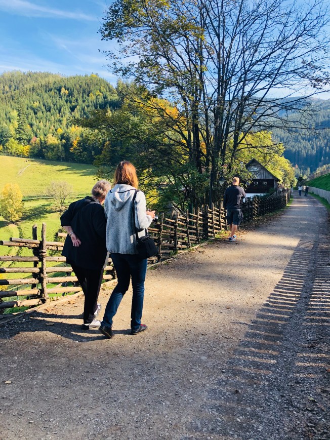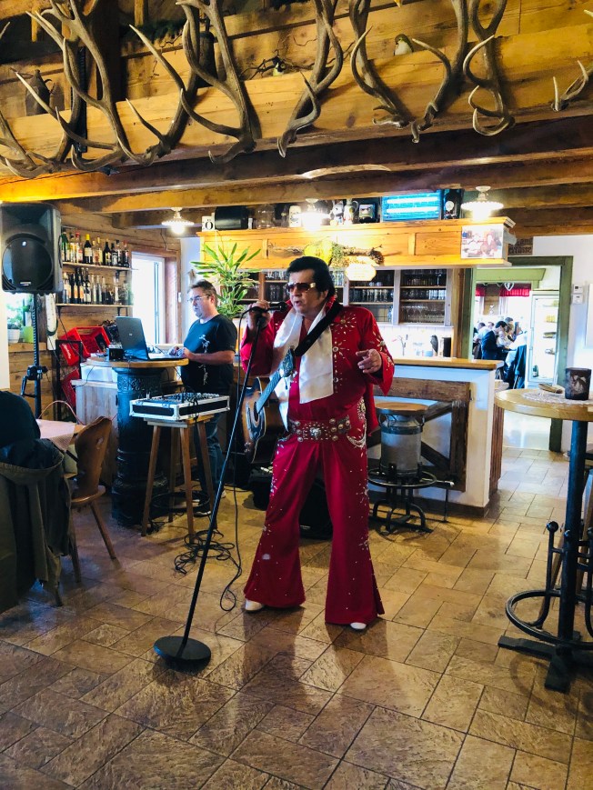 A short drive up the same mountain and an even shorter walk later through an idyllic farming landscape, most of us somehow still had tummy room for an assortment of typical Austrian desserts at a nearby historical old house in the hills … apple strudel of course, palatschinke or palacsinta (a thin crêpe-like variety of pancake) a torte or two … while sipping cappuccinos. A bit of a surreal experience was discovering an Elvis impersonator entertaining a private party inside the log house when I stepped inside to use the WC 😊