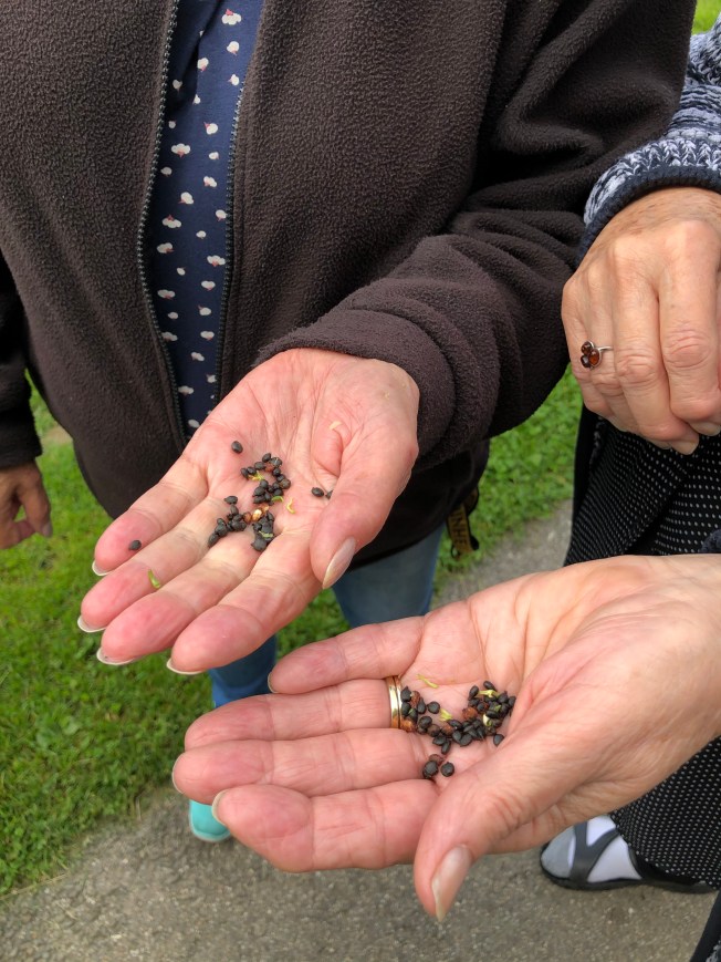Felix shows us an edible seed reminiscent of a sesame seed, inside a local flower.