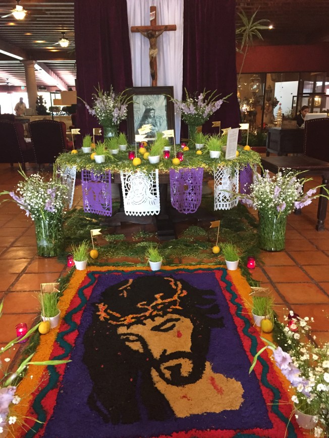 Four straight years of participating in the Holy Week of Easter in San Miguel left Bev and I opting out of too much mingling and moving with the masses this year. In years past, we had often followed and photographed to excess perhaps, the many somber and celebratory processions that flow throughout the city. San Miguel comes alive at Easter, with Mexican tourists flocking here from all over the country, intermingled with a handful of Europeans, Americans and Canadians all eager to experience the legendary Easter religious rituals performed by locals every year. Sometimes it is enough to just enjoy the general ambiance. That often meant staying behind, enjoying our peaceful garden patio with a good book in hand :), or enjoying a meal or drink at a cafe near the Centro and viewing all the hullabaloo from a distance. One can still catch a hint of mastranzo (a minty herb) and chamomile wafting in the air … masses of these herbs are used over the two holy weeks … inside homes, lining the streets for certain processions, in churches, businesses, restaurants, decorating the various altars depicting the seven stations of the Passion of Jesus Christ. Need I say, San Miguel is a very religious city, high on Catholic rituals. For some reason, Mexican Catholic celebrations sit more comfortably with me than they do in other countries and generally I do enjoy the religious ambiance that prevails here at Easter … hmmm. However, it WAS a pleasant feeling to not participate as a harried tourist, frantically trying to capture every moment through a phone lens. I have certainly done both in my day :).