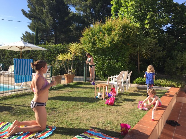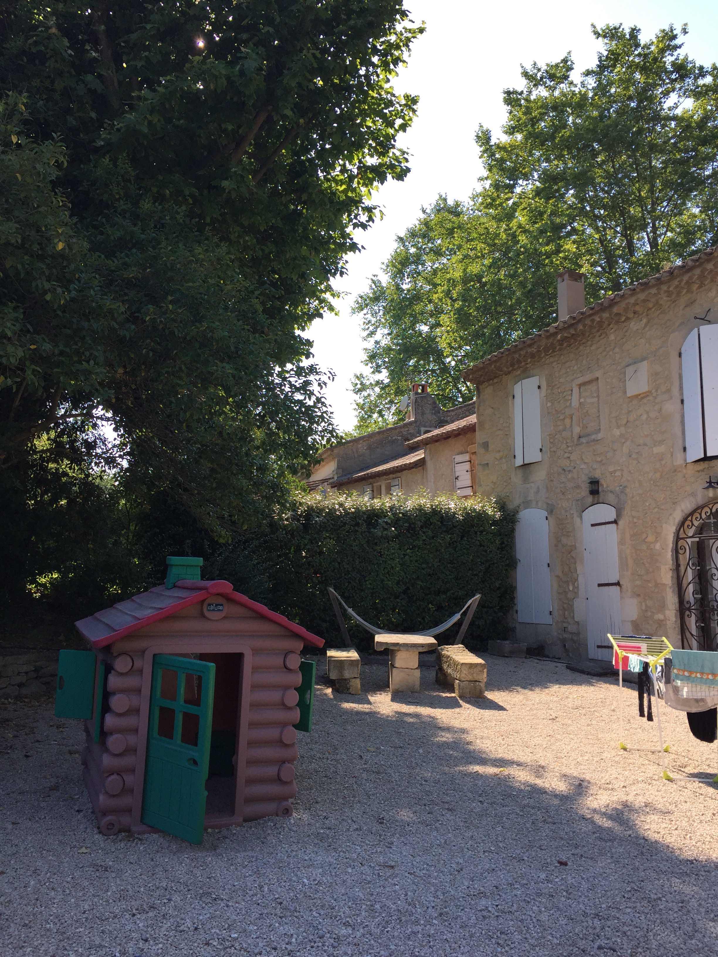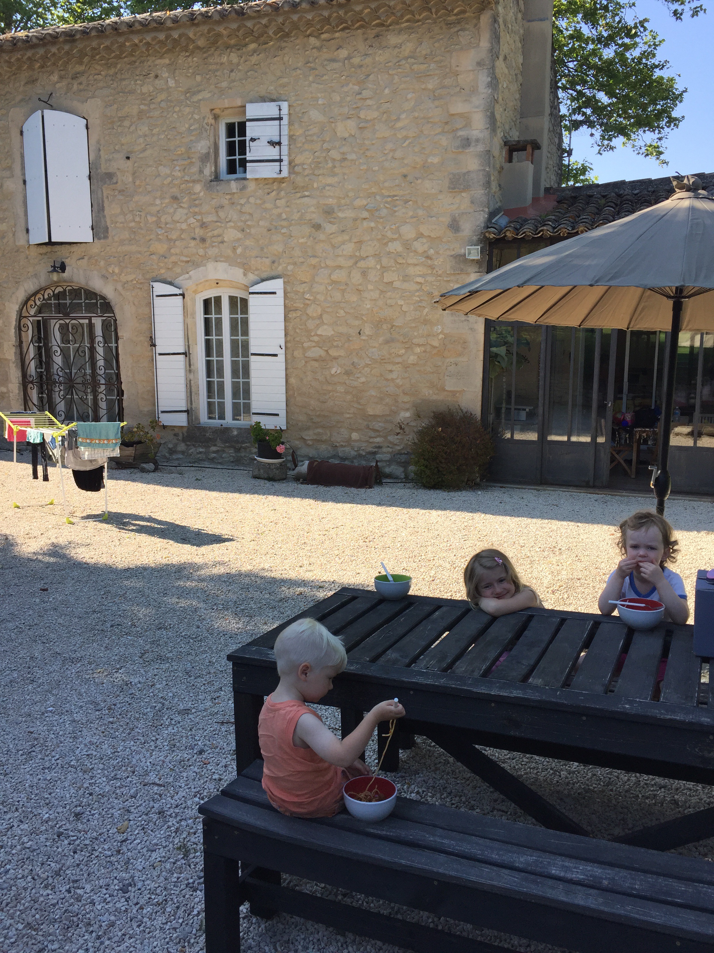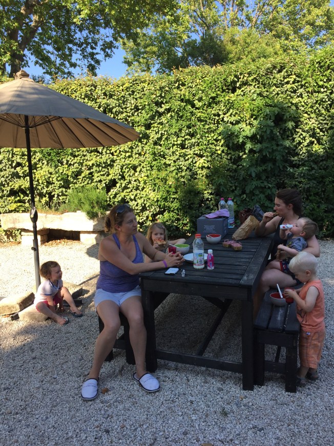 We bid au’revoir to seaside Cassis and the Mediterranean and hit the inland freeways, where cruising speeds of 140 – 160 are the norm …. toll stations appear to be part of every road network, thus far, ranging from a few Euro per use to well over twenty … beautiful roads but costly to drive! We arrive at our next destination, a converted farmhouse in San Remy …. a touch of tranquility in Provence! A place to stretch out, chill, swim, let the kids, big and small kick a soccer ball around the acres of grass, jump on a trampoline, explore a quaint town teeming with restaurants and the many nearby vineyards and oh yes, give everyone a chance to do laundry as well 🙂 ….