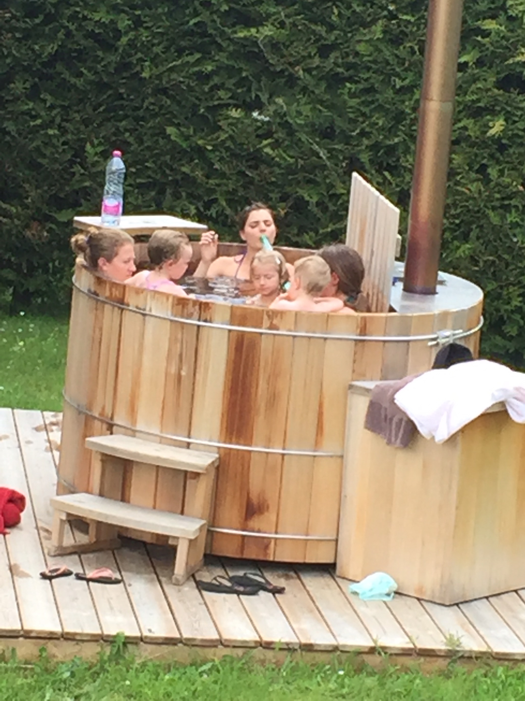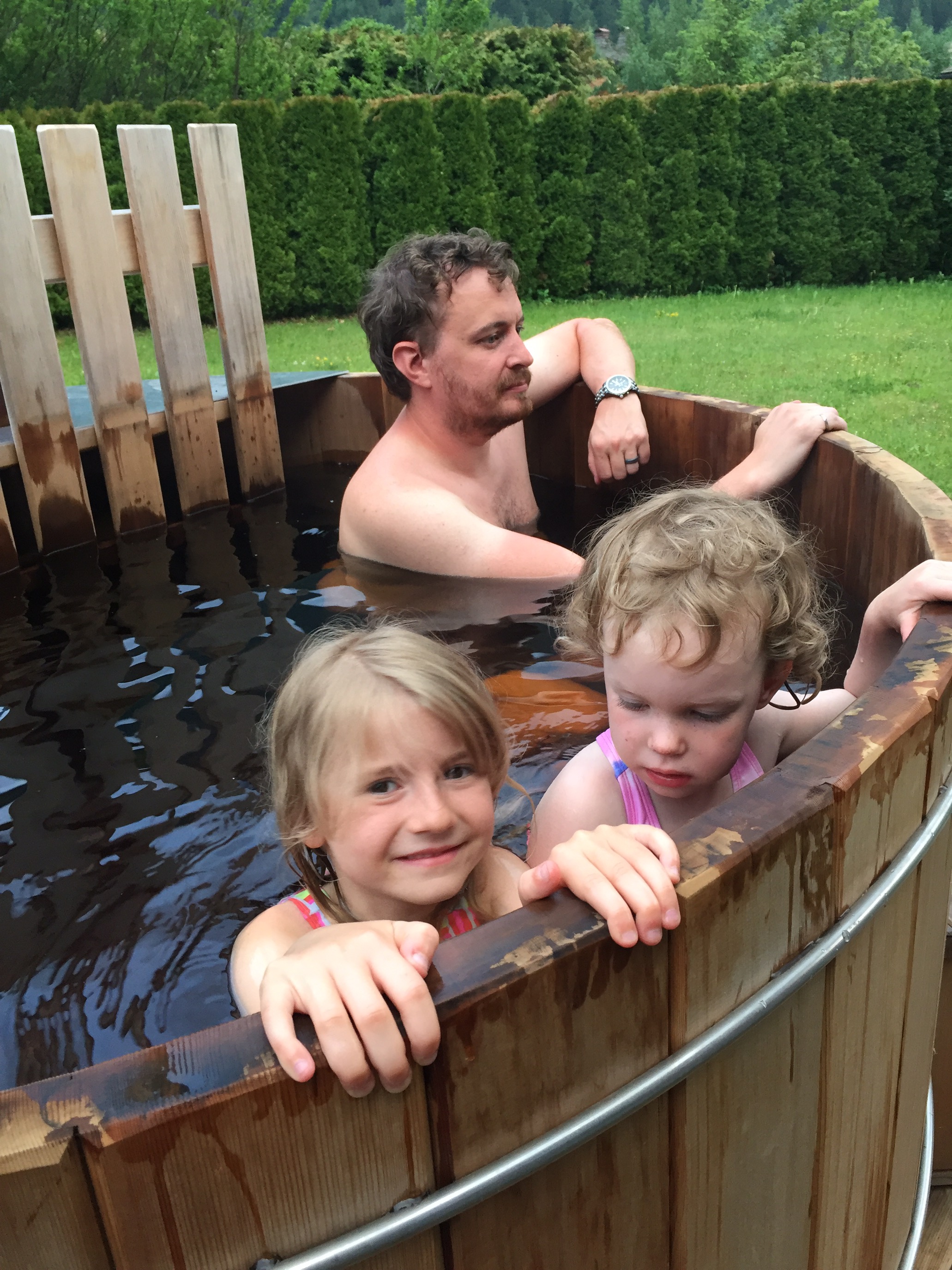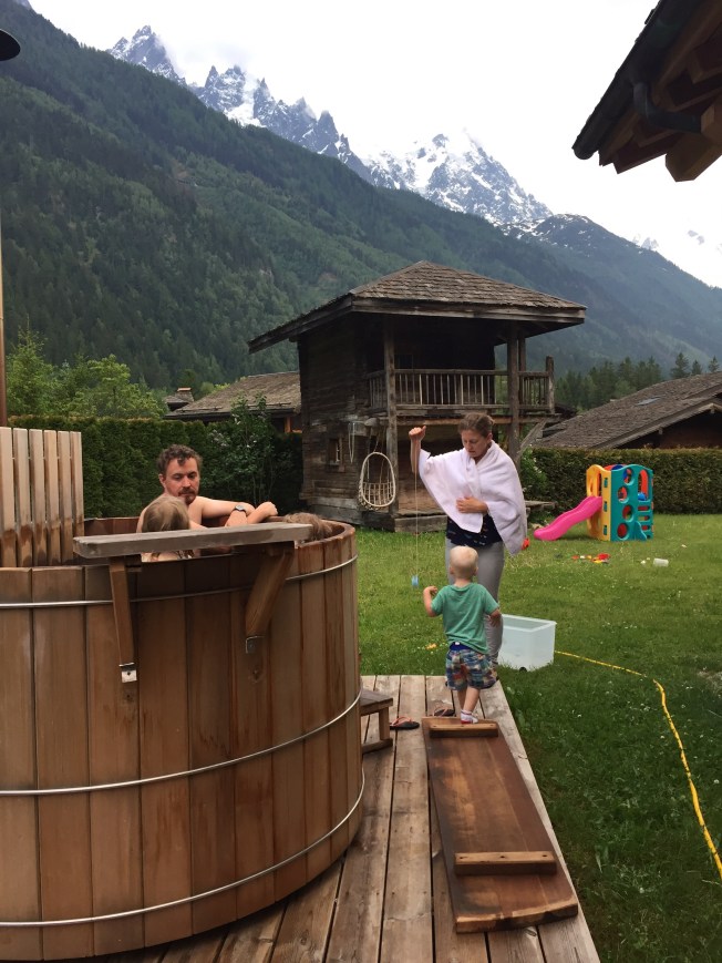 The chalet the kids had found yet again on trusty Airbnb was everything one could wish for in a mountain setting! More rooms than we needed certainly but utilize them we did! Thrilled to find a true Finnish sauna and cedar hot tub outside!!! And once again, a child’s dream yard where Ronan, Quinn, Oliver and Aliana could play and squabble in equal measure with abandon, or soak in the warmth of the hot tub, or just enjoy a patio surrounded by mountain views one could only dream of.
