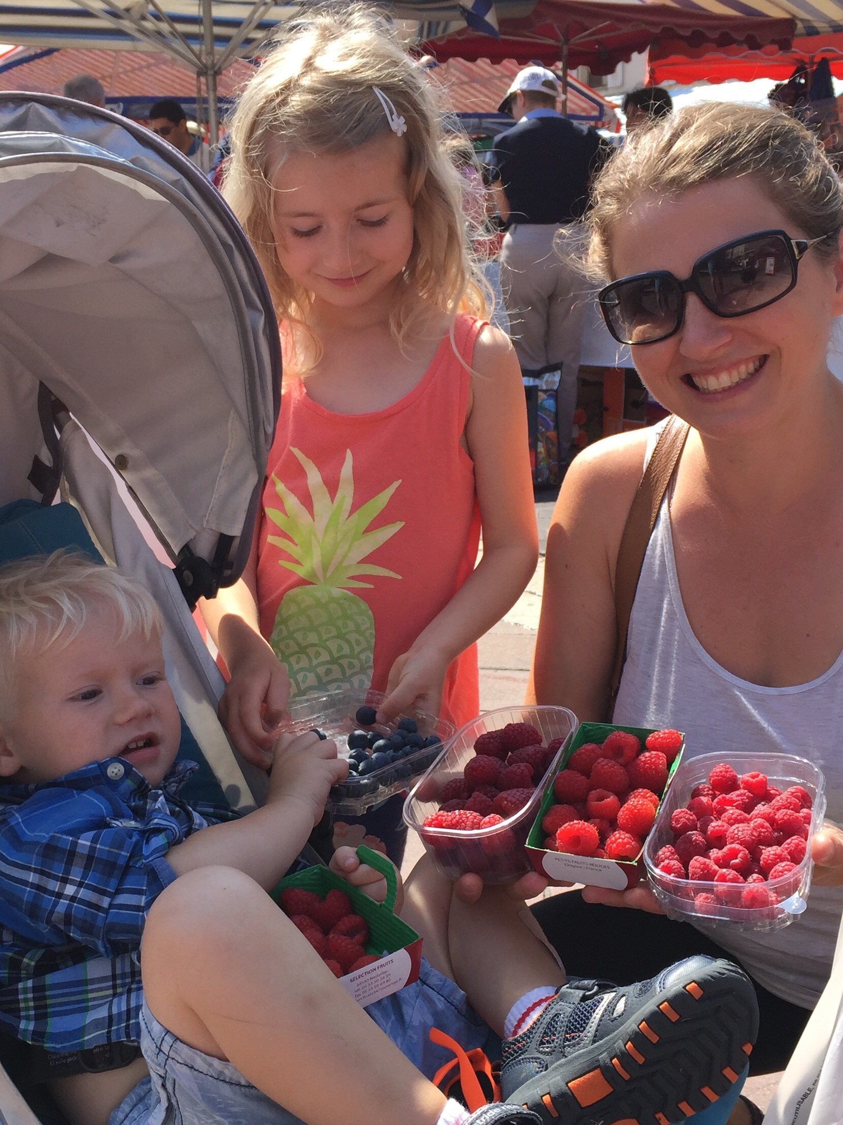 A final early evening walk along the sea, an extravagantly delicious dinner at La Petite Maison, a restful sleep, a morning walk to the market for berries and we were off again for the long commute home! Thank you my children, my grandchildren, Jenn and Gary et al for a most memorable trip! Love them all very much. Au revoir français c’est un voyage amusant!