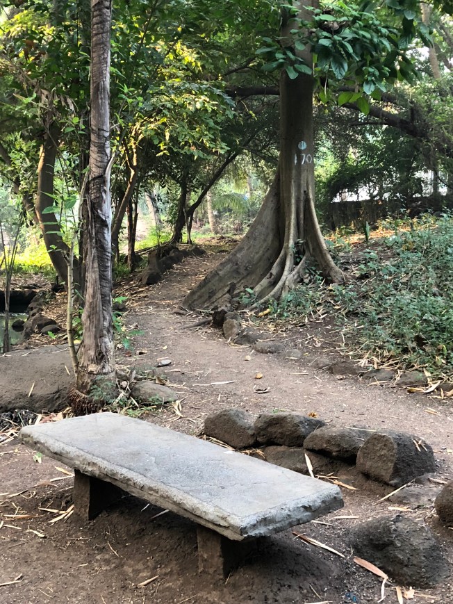 There is virtually not a speck of earth on the Ashram walkways that is not covered in concrete tile, granite or marble including the interior of all the meditation buildings and guest houses. The appearance is certainly lovely and zen like, and cool marble is heavenly in bare feet. Undoubtedly the maintenance and cleaning is substantially easier …. but dancing, standing, sitting and walking on such hard surfaces for a week has taken a bit of a toll on my body … this walk through nature is a delightful and welcome respite and my knees are literally dancing with joy, thanking me with every step 🙏. Discovering a bench along the way, I walk over, settle quietly and surround myself in nature’s music, nature’s healing ambiance ….