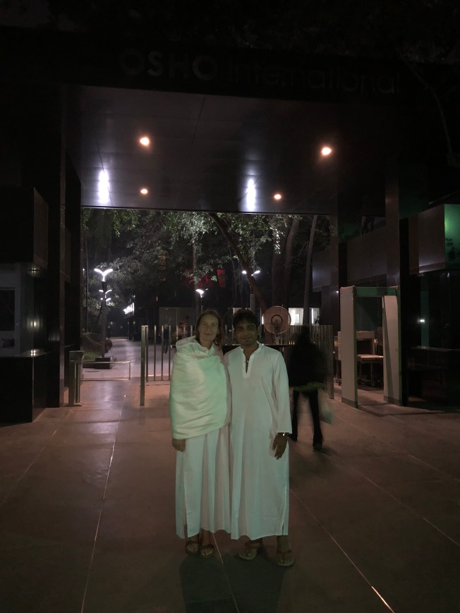 Akshay lives in a small town a few hundred kms from Pune and has been coming monthly to Osho’s for a few years. His rivers, like Marie’s, run deep. Both spiritually wise beyond their years … so amazing to have shared even a small portion of this experience with two such beautiful souls. Both contemplate remaining for an indefinite period of time at Osho’s and indeed are considering staying on as sannyasins. Here we are in our evening robes at the front gate to Osho’s where pictures are allowed … after the meeting and meditation.